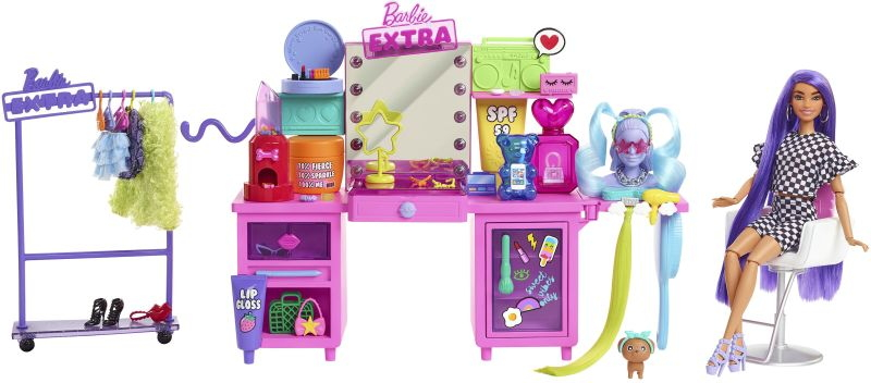 Barbie Extra Στούντιο Ομορφιάς Σετ Με Κούκλα Η κούκλα Barbie® Extra είναι έτοιμη για σούπερ μοντέρνες εμφανίσεις με αυτό το σετ που περιλαμβάνει περισσότερα από 45 κομμάτια και έχει σχεδιαστεί για να ζωντανέψει τις αμέτρητες ιστορίες μόδας των παιδιών!Με 11 “αρθρώσεις”, μακριά μοβ μαλλιά και εντυπωσιακή εμφάνιση, αυτή η αποκλειστική…
