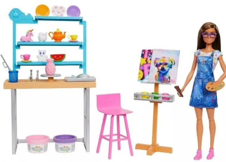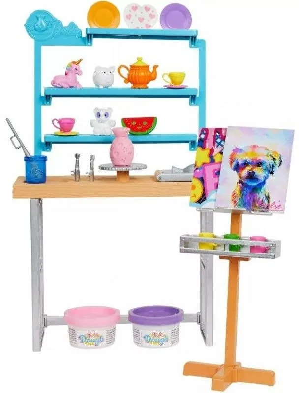 Barbie Στούντιο Ζωγραφικής Αφήστε τη φαντασία σας να δημιουργήσει στο εργαστήριο αγγειοπλαστικής και ζωγραφικής. Δημιουργήστε και διακοσμήστε τα δικά σας αντικείμενα με τις πλαστελίνες. ζωγραφίστε τους πολύχρωμους καμβάδες.