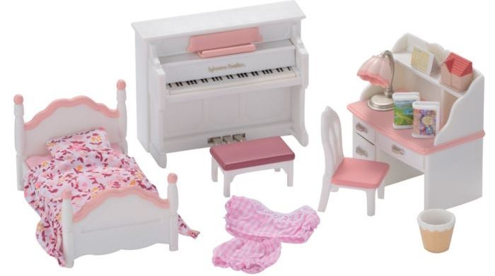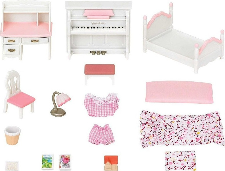 Sylvanian Families: Έπιπλα Για Κοριτσίστικο Δωμάτιο (5032) Αυτό το ρομαντικό σετ επίπλων για τα κορίτσια των Sylvanian Families θα σας μαγέψει και θα ομορφύνει τα σπιτάκια σας.Περιλαμβάνει: Ένα κρεβάτι μονό, ένα πιάνο με σκαμπό, ένα γραφείο με ράφια και καρέκλα, διάφορα διακοσμητικά.