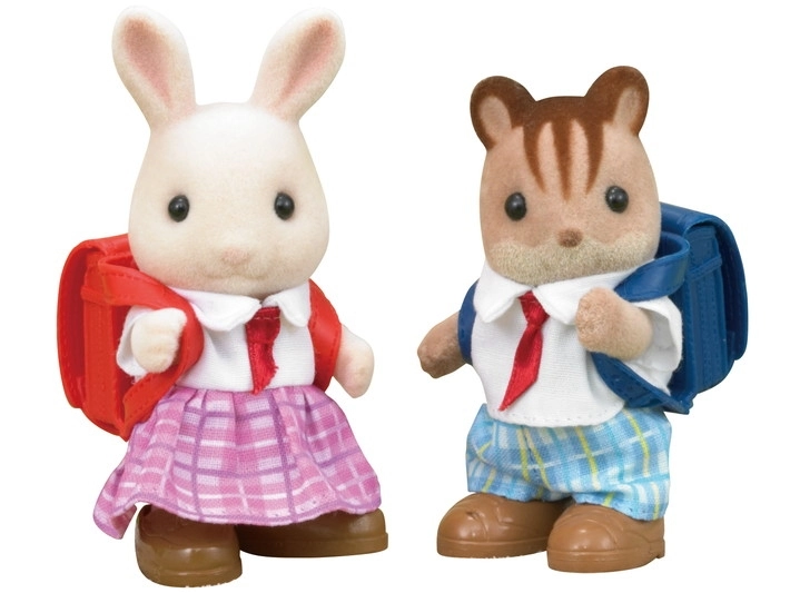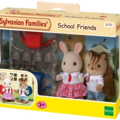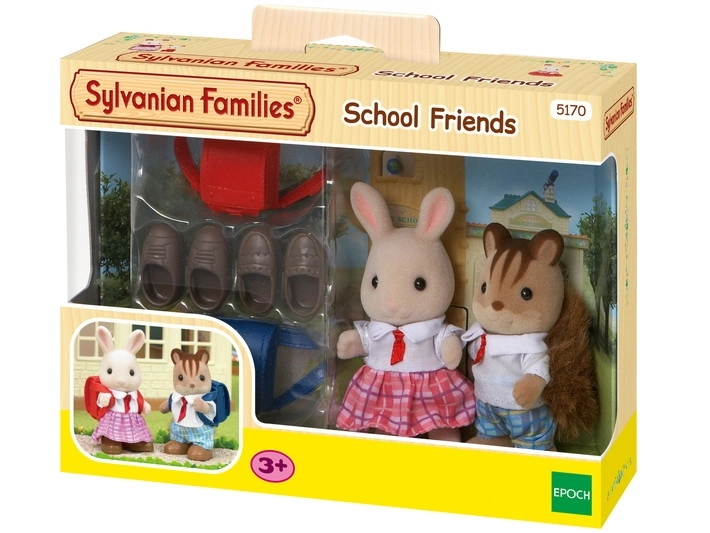 Sylvanian Families: SCHOOL FRIENDS (5170) Αυτό το σετ περιλαμβάνει την Rebecca the Milk Rabbit Girl και τον Ralph the Walnut Squirrel Boy. Φαίνονται αξιολάτρευτοι με τις στολές τους που περιλαμβάνουν σχολικά παπούτσια, καρό στολή, ένα άσπρο πουκάμισο, κόκκινη γραβάτα και σακίδιο. Είναι έτοιμοι να διασχίσουν το λιβάδι προς το Country…